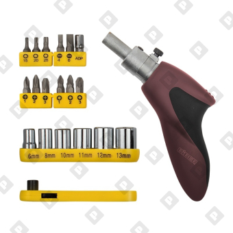 Описание и особенности: Хром-ванадиевая сталь повышенной твердости. Обрезиненная эргономичная ручка с реверсивным механизмом. Набор из 20 предметов: торцевые головки - 6, 8, 10, 11, 12, 13 мм, биты: плоский шлиц 4, 6 мм; крестовой шлиц #1, #2, #3; крестовой шлиц Pozi #1, #2, #3; шлиц торкс #15, #20, #25; переходник; плоская трещотка для бит.