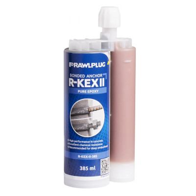 Химический анкер Rawlplug R-KEX-II представлен в двухкомпонентной упаковке, включая картридж с эпоксидной смолой и отдельный картридж с отвердителем. Предназначен для установки резьбовых шпилек, анкеров с внутренней резьбой и арматуры в бетон. Допущен для работы в бетоне с трещинами и без трещин, срок службы до 100 лет. Минимальная степень усадки позволяет выполнение анкеровки в отверстиях просверленных алмазными свёрлами.